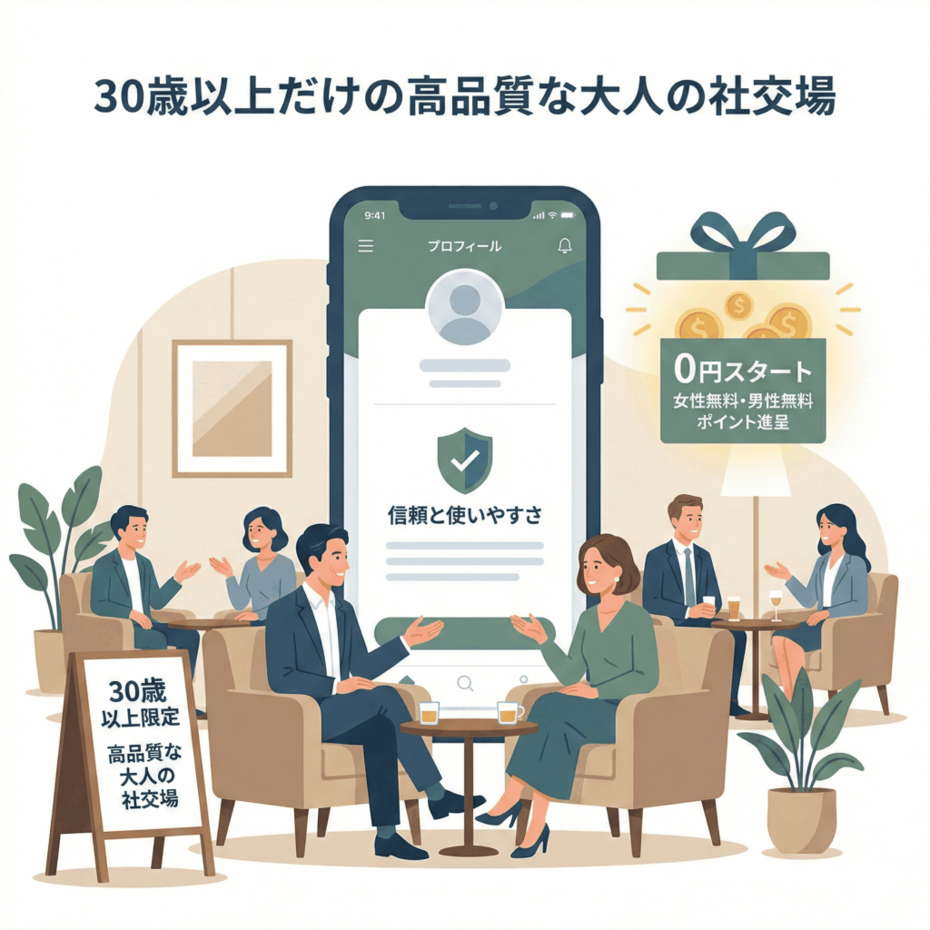 最大のポイントは、 利用者が30歳以上に限定 されているため、最初から「共通の話題」や「年齢相応の悩み」を共有できる点です。現在、女性は完全無料、 男性は新規登録時に2,000円分(200ポイント)の無料試供ポイント が付与されるキャンペーンを実施中。