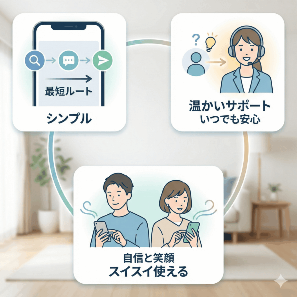 具体的には、数タップで希望条件の絞り込みができ、気になる相手へのアプローチもスムーズです。さらに、万が一操作で困った際も、丁寧なサポート体制が整っているため安心です。この 「頑張らなくても使える」 快適さが、忙しいビジネスマンやデジタルに苦手意識を持つシニア層からも高く支持されている理由です。余計なストレスを感じず、純粋に出会いだけに集中できる環境を提供しています。
