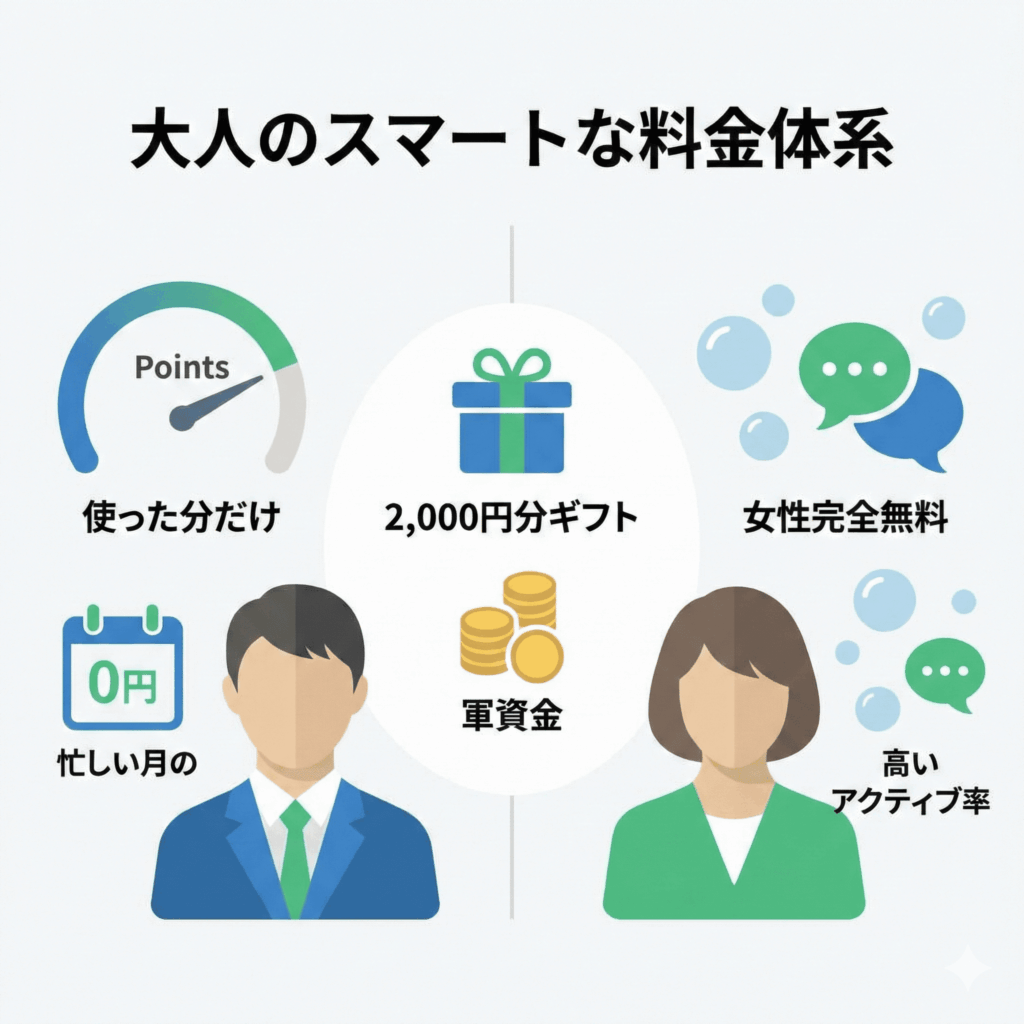 「男性はポイント制なので、自分のペースで進められるのがいいですね。最初は無料ポイントで様子見しましたが、今は月1〜2回、自分のタイミングで使っています。」