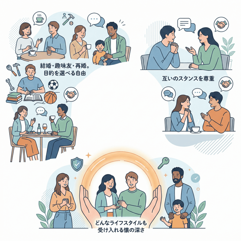 人生経験を積んだ大人だからこそ、相手に求める条件も多様です。「まずは食事から始めたい」「趣味の話をじっくりしたい」といった、それぞれのスタンスを尊重し合える風土があります。再婚希望者やシングルの方も多く、お互いの事情を理解した上で深い関係を築きやすいのも特徴です。 多様なライフスタイルを受け入れるこの「懐の深さ」 が、多くのユーザーに愛され続けている理由です。