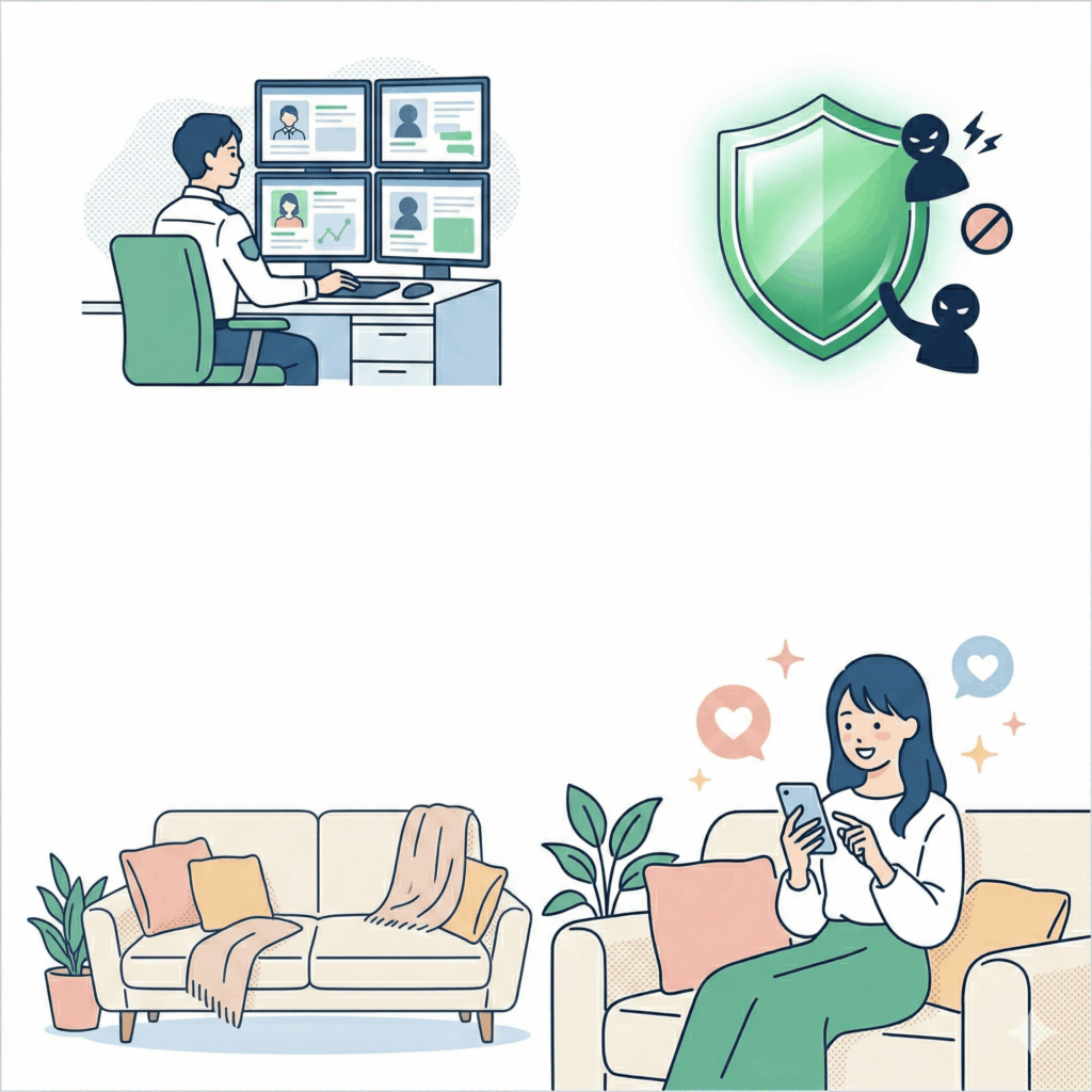 ネット上の出会いにおいて、 最大の懸念点は「サクラ」や「業者」の存在 ではないでしょうか。華の会メールでは、システムによる自動チェックだけでなく、 専門スタッフによる24時間365日の有人監視体制 を敷いています。不審な動きをするアカウントや、規約に抵触する投稿は即座に検知・排除されるため、クリーンな環境が常に保たれています。